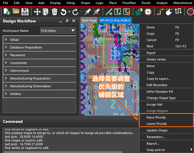 这里同样通过菜单栏上的【Shape -> Select Shape or Void/Cavity】命令,选中需要提高或者降低优先级的铺铜区域,然后点击鼠标右键菜单上的【Raise Priority】或者【Lower Priority】选项,就可以提高或者降低该铺铜区域的优先级。