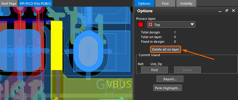 如果存在有孤铜区域(上图黄色框选部分),那么首先需要执行菜单栏上的【Shape -> Delete Island】命令,然后在 Allegro PCB Editor 右侧控制面板上的【Options】选项卡下面,点击【Delete all on layer】按钮删除这些孤铜区域: