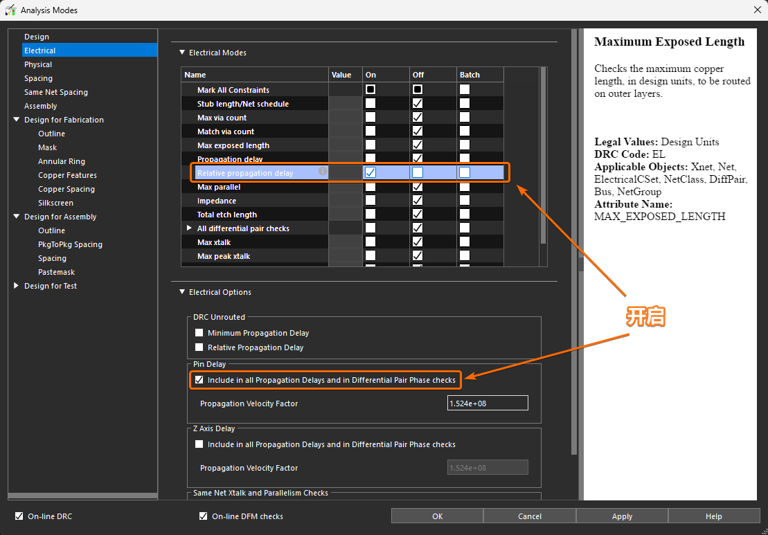 Relative propagation delay为【On】选项,以及界面底部的【Pin Delay】选项; - 分别设置该等长组的