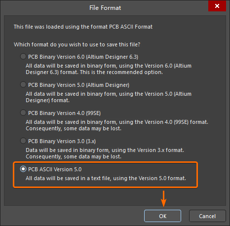 .PrjPcb),鼠标选中工程名称展开右键,选择Add Existing to Project,将刚才嘉立创 EDA 导出的.schdoc和.pcbdoc文件添加到工程当中,并且将该工程保存为PCB ASCII Version 5.0格式(ASCII 格式的 Altium Designer 工程文件是一切的关键所在):