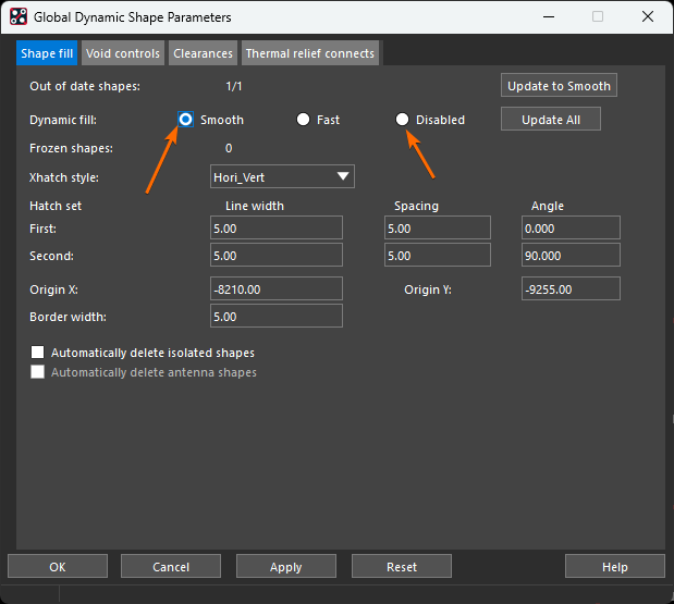 Edit -> Split Plane -> Parameters…,勾选填充风格为Solid实心填充; - 接着鼠标选择 Allegro 菜单栏上的