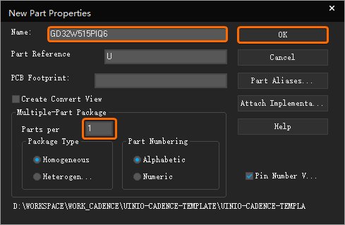 对话框,需要再继续填写原理图符号的名称(这里假设为GD32W515PIQ6),然后鼠标点击【OK】按钮: