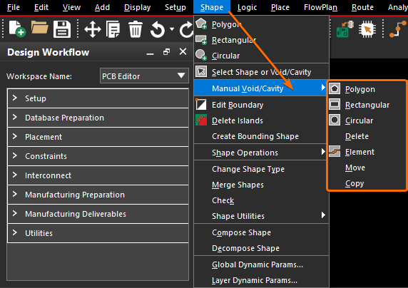 挖铜就是移除多余的铺铜区域,执行 Allegro PCB Editor 菜单栏上的【Shape -> Manual Void/Cavity】项,就可以展开下图中的一系列挖铜命令: