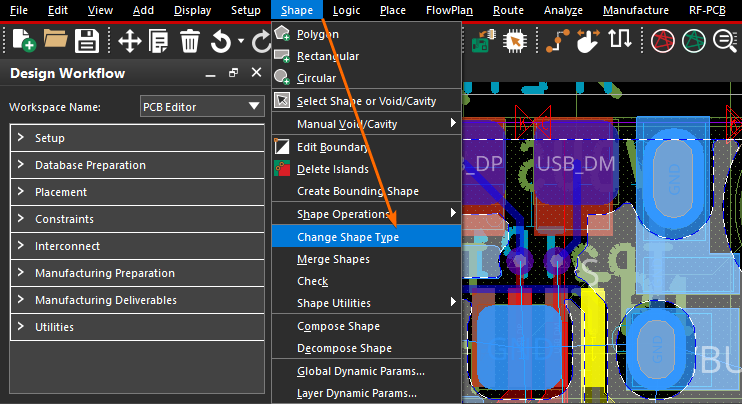 首先,依然需要执行菜单栏上的【Shape -> Select Shape or Void/Cavity】命令,选中需要进行转换的铺铜区域,然后点击鼠标右键菜单上的【Change Shape Type】选项,就转换铺铜区域的静态与动态属性: